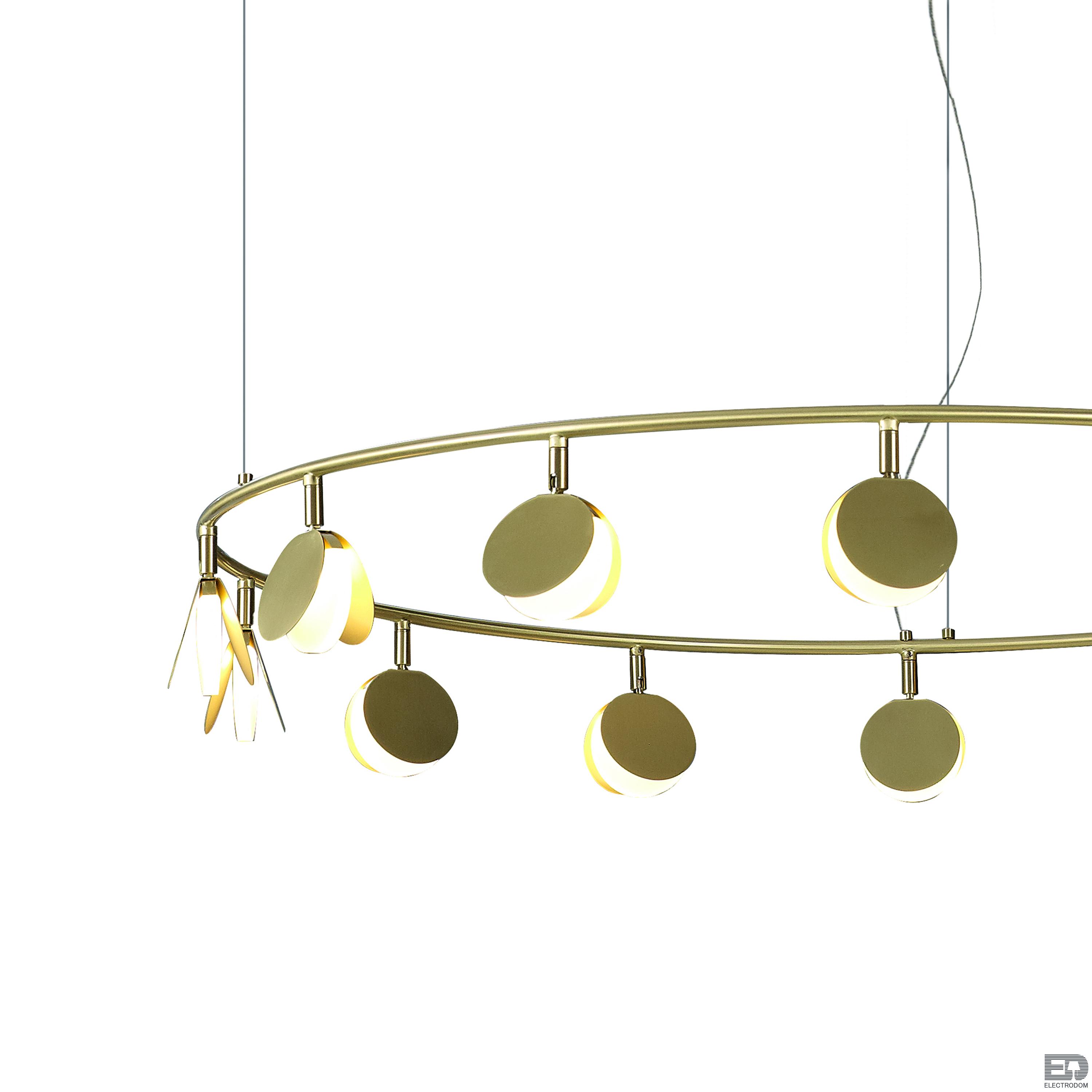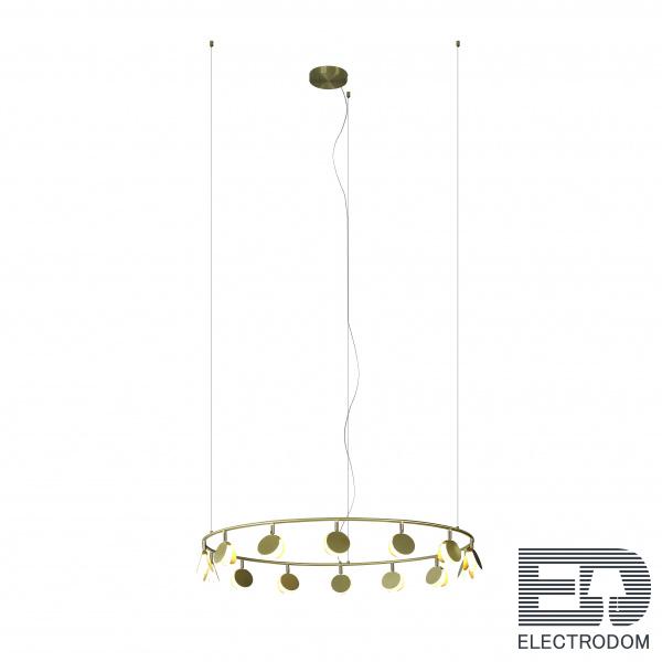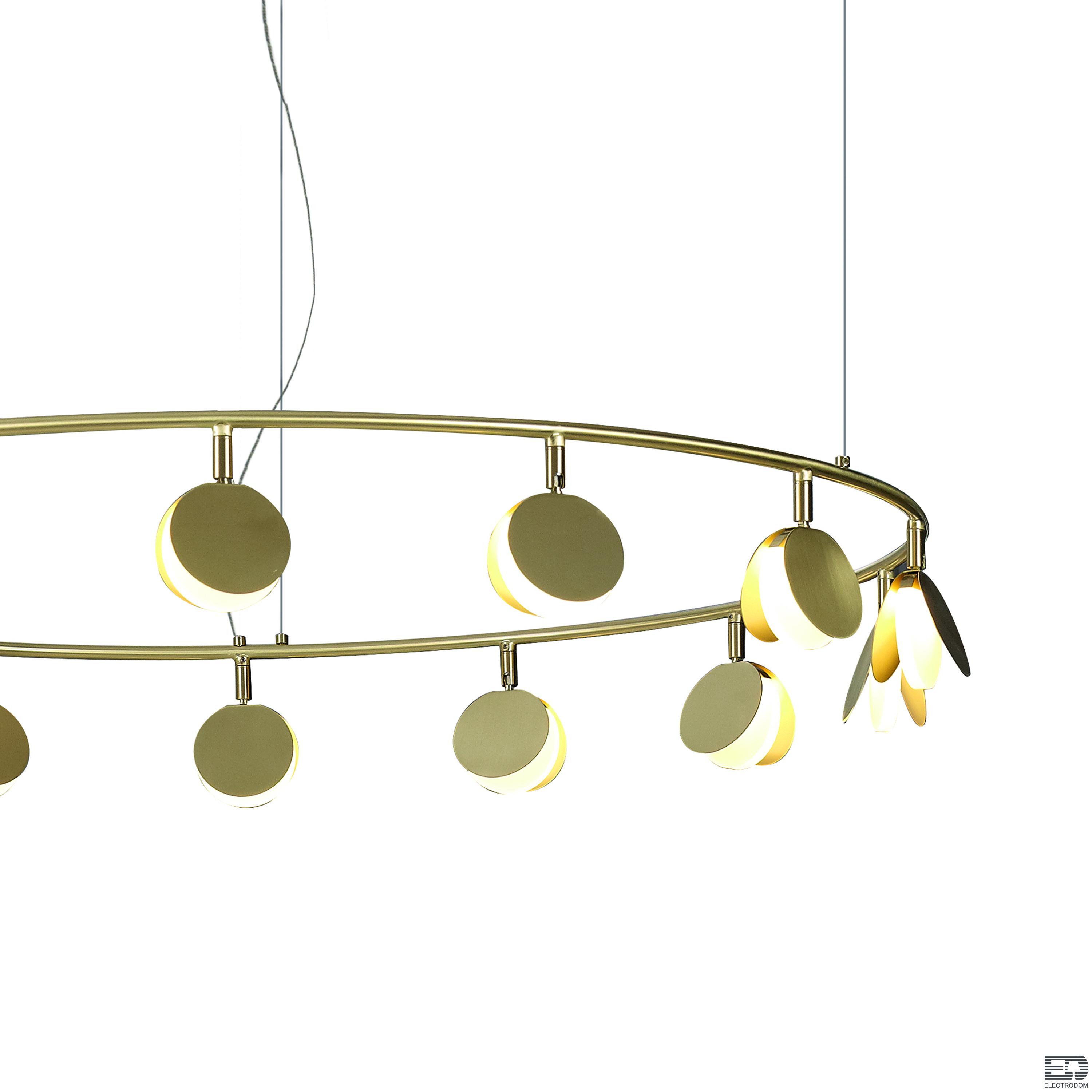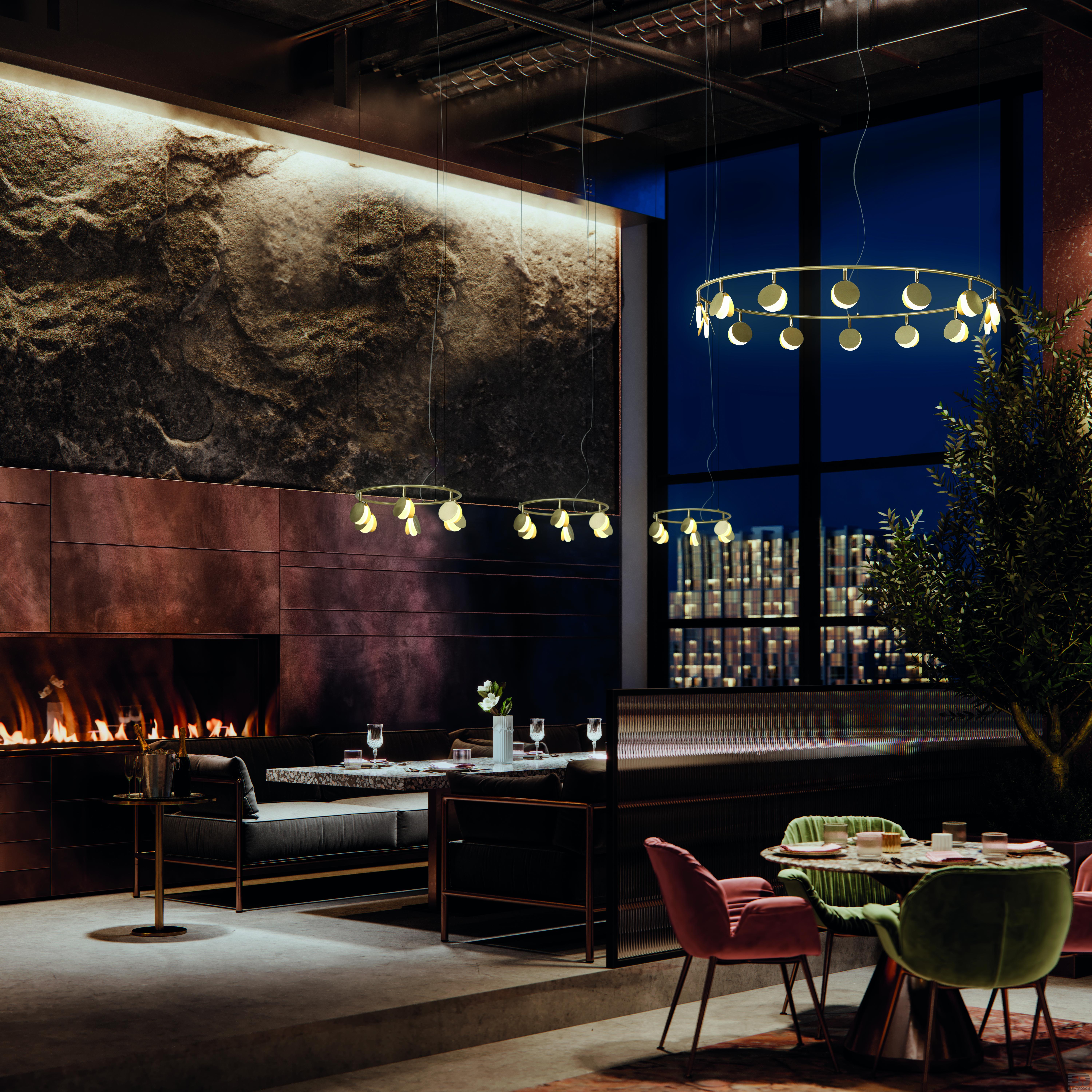 Коллекция выполнена в золотой отделке и доступна в нескольких размерах. Разные системы подвесок позволяют адаптировать светильник под задачи вашего интерьера. Самая большая трехъярусная композиция коллекции представляет собой три кольца разного диаметра с разным количеством светодиодов на каждом ярусе.