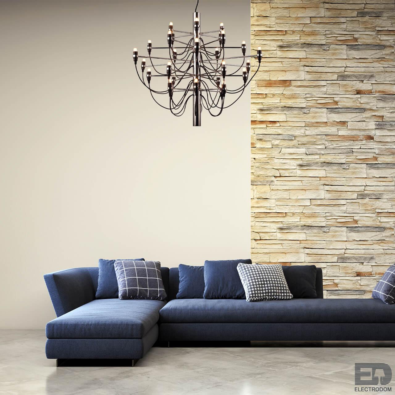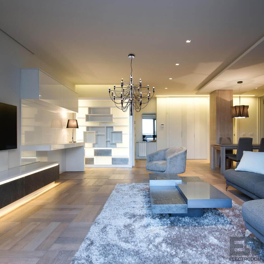 Мощный поток света позволяет использовать ее как единственный источник освещения даже для большого метража. При желании потолок можно дополнить встраиваемыми светильники, которые подчеркнут изящество и простоту люстры.