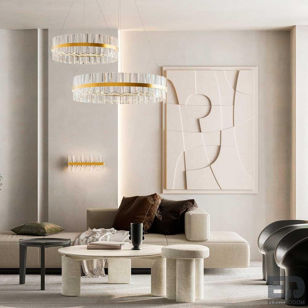 Мощный поток света позволяет использовать ее как единственный источник освещения даже для большого метража. При желании потолок можно дополнить встраиваемыми светильники, которые подчеркнут изящество и простоту люстры.