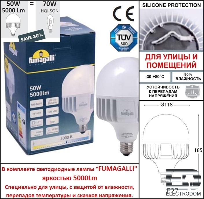 Комплектация С светодиодной лампой "fumagalli" e27 high power led 50w. Специально для улицы, яркость 5000 lm. С защитой от перепадов температуры, повышенной влажности и скачков напряжения.